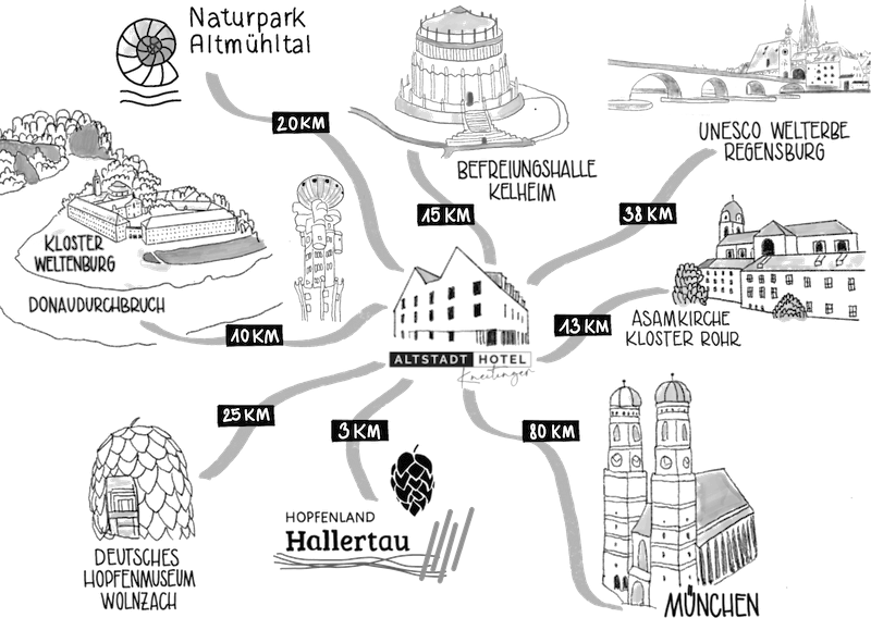 Dank der zentralen Stadtplatz Lage ist das Hotel Garni der perfekte Ausgangspunkt, um sowohl die Stadt selbst als auch die Umgebung zu erkunden. Ob kulturelle Highlights, kulinarische Erlebnisse oder Tagesausflüge im Hopfenland Hallertau. Alles ist bequem erreichbar und lässt sich optimal mit einem Aufenthalt bei uns verbinden.