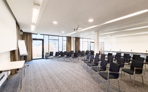 Unser größter Raum (56 m²) ist das Herzstück für Seminare und Tagungen. Dank einer teilbaren Wand und der quadratischen Grundfläche lässt er sich flexibel gestalten. Von klassischer Parlament-Bestuhlung bis Kino-Atmosphäre für 20 bis zu 40 Gäste.